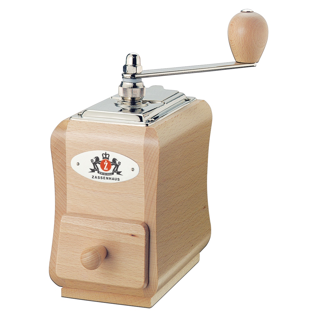 Die Traditionsmarke Zassenhaus ist seit 1867 im Bereich der Kaffeemühlen Spezialist für Präzisionsmahlwerke. Klassische Kaffeemühlen, die von Hand betrieben werden, bestehen äußerlich grundsätzlich aus einem Holzkorpus mit Trichteraufsatz, in den die Kaffeebohnen eingefüllt werden und einem zumeist als Schubfach integrierten Auffangbehälter für den gemahlenen Kaffee. Das Herz der Mühle bildet ein so genanntes Kegelmahlwerk. Das original Zassenhaus-Kegelmahlwerk wird aus robustem Edelstahl gefertigt und erhält durch seine besondere Härtung eine extra lange Lebensdauer. Es wird mit einer Kurbel betrieben, die sich mit und entgegen dem Uhrzeigersinn drehen lässt. Diese Kurbel ist über eine Spindel mit dem Mahlkegel und dem Mahlring mit besonders scharfer Zahnung verbunden. Eine Rändelschraube mit Verstellsicherung unterhalb der Kurbel dient der Regulierung des Mahlgrades. Dieser kann bei den Zassenhaus-Kaffeemühlen stufenlos von espressopulverfein bis filteroptimal eingestellt werden – ein gleichbleibendes Mahlergebnis garantiert. Durch Drehen im Uhrzeigersinn ergibt sich eine gröbere Mahlkörnung; durch Drehen entgegen dem Uhrzeigersinn eine feinere.