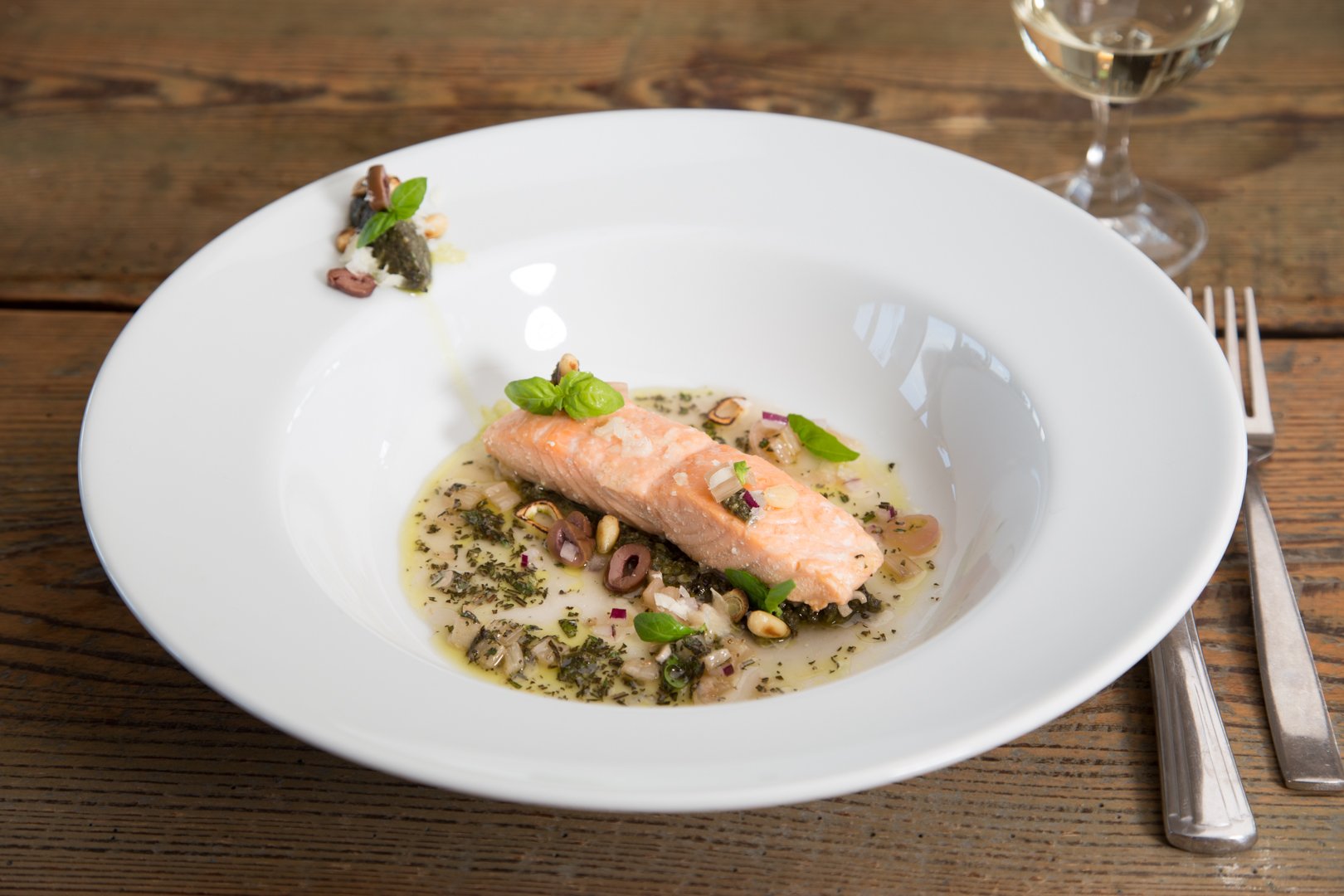 Lachs mit Olivenpesto und dem Kräutersud auf einem tiefen Teller anrichten.
