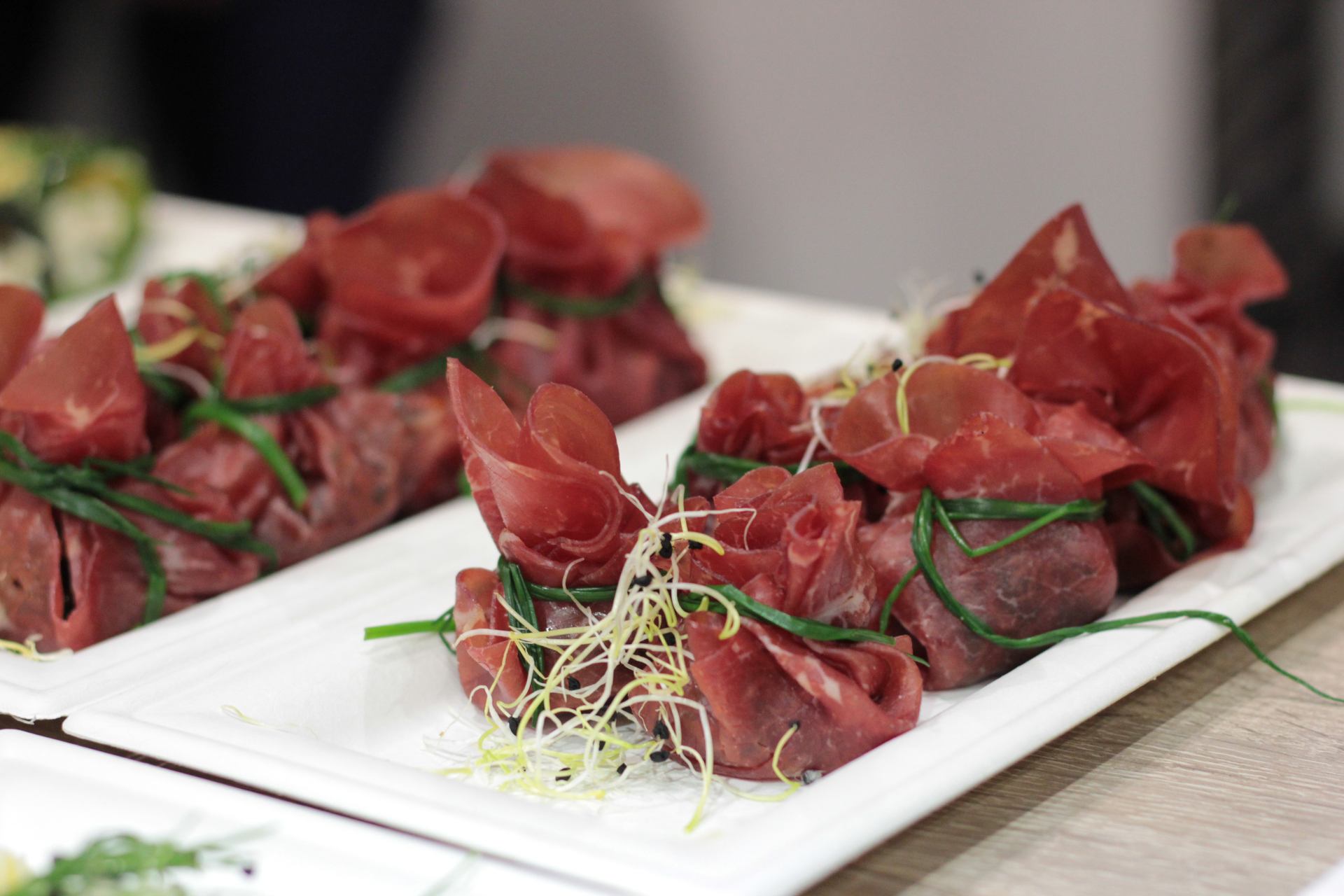 Jeweils etwas von der Füllung mittig auf die Bresaola-Scheiben setzen. Diese dann zum Säckchen hochziehen und mit Schnittlauchhalmen, welche vorher im Dampfgarer blanchiert wurden, zusammenbinden.