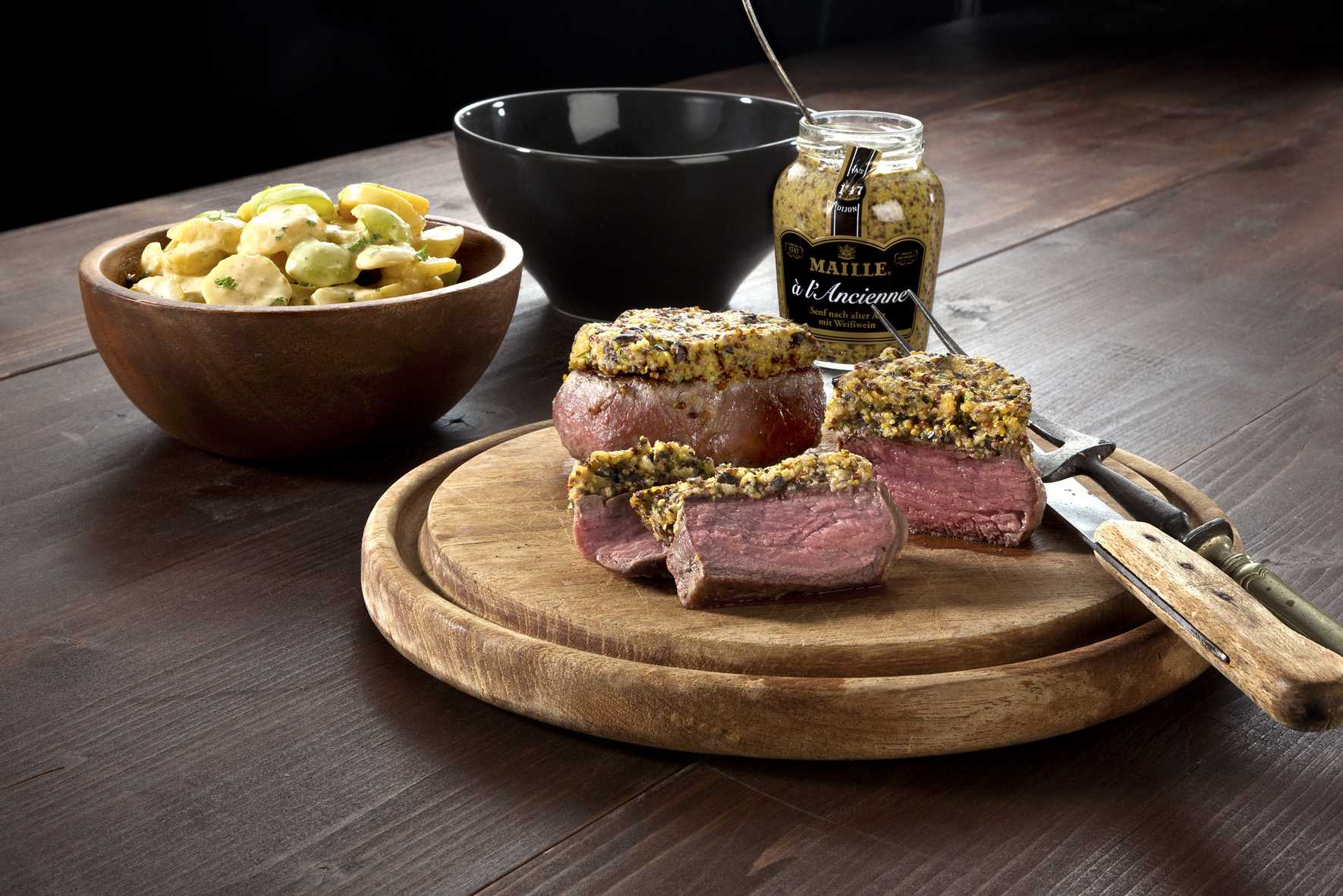 Rustikal und edel zugleich: Zartes Kalbsfilet in Kombination mit einer Oliven-Senf Kruste. Serviert mit einem raffiniert-fruchtigen Kartoffel-Salat entsteht die perfekte Balance zwischen gehaltvoller und leichter Küche.