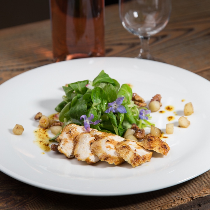 Für die Vinaigrette Honig, Essig und Senf mischen und gut verrühren. Anschließend das Olivenöl mit dem Schneebesen bis zur gewünschten Konsistenz unterrühren. Vinaigrette unter den Salat heben. Jede Hähnchenbrust in je 10 Tranchen schneiden. Salat und Hähnchenbrust auf einem großen Teller anrichten. Abschließend karamellisierten Apfel und Walnüsse hinzugeben. Mit Blüten dekorieren.