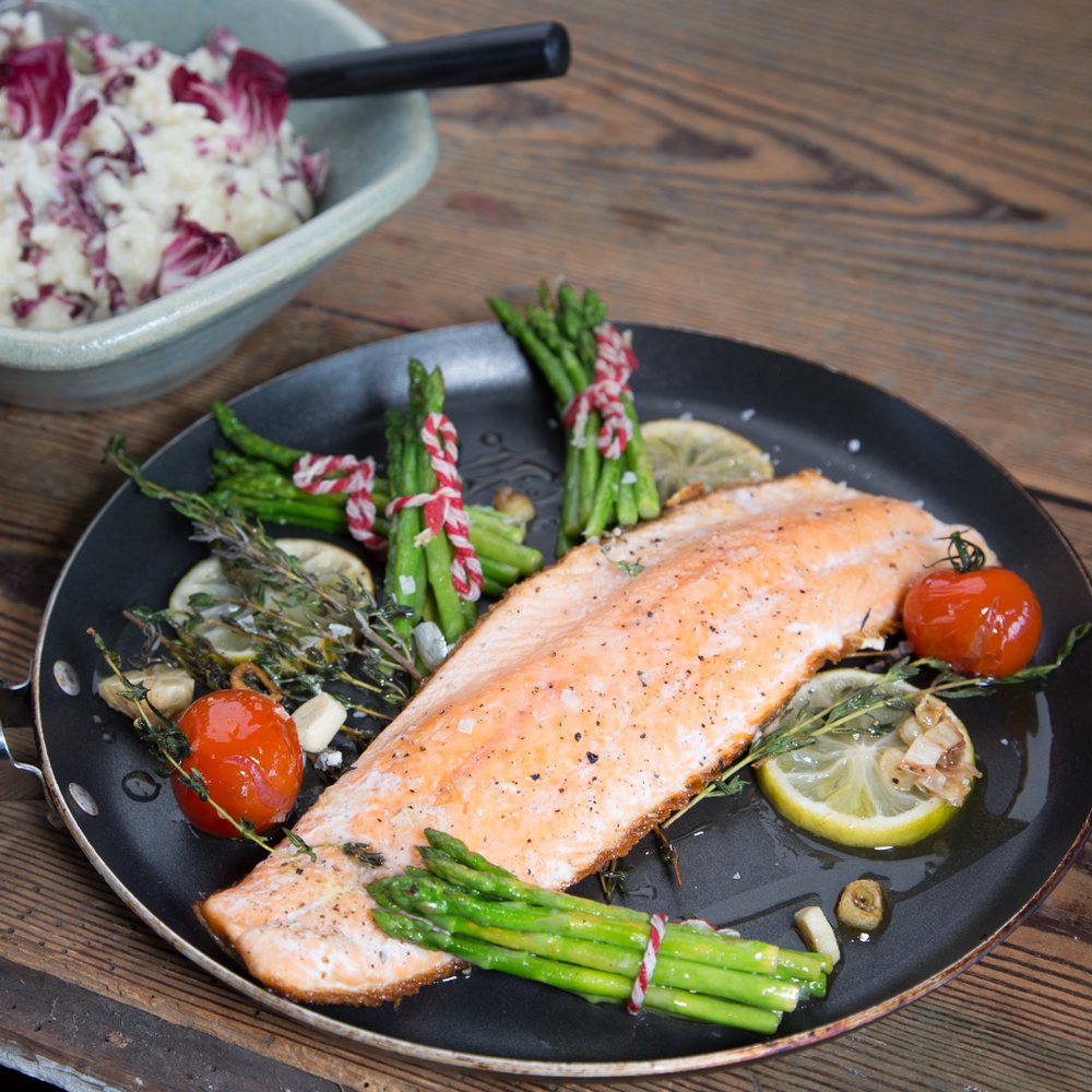 Das Saiblingsfilet salzen, pfeffern und mit etwas Zitronensaft beträufeln. Das Öl in der Pfanne erhitzen und Thymianzweige sowie halbierte Knoblauchzehe dazugeben. Anschließend den Fisch auf der Hautseite in die Pfanne legen und dann je nach Größe 4 bis 6 Min. fertig braten.